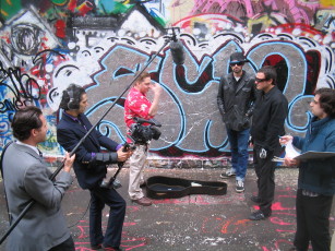 (l - r) Director: Bryan Connolly - - - Cinematographer and Sound: Mark Sabourin - - - Filming in the alley behind the historic Capitol Theater